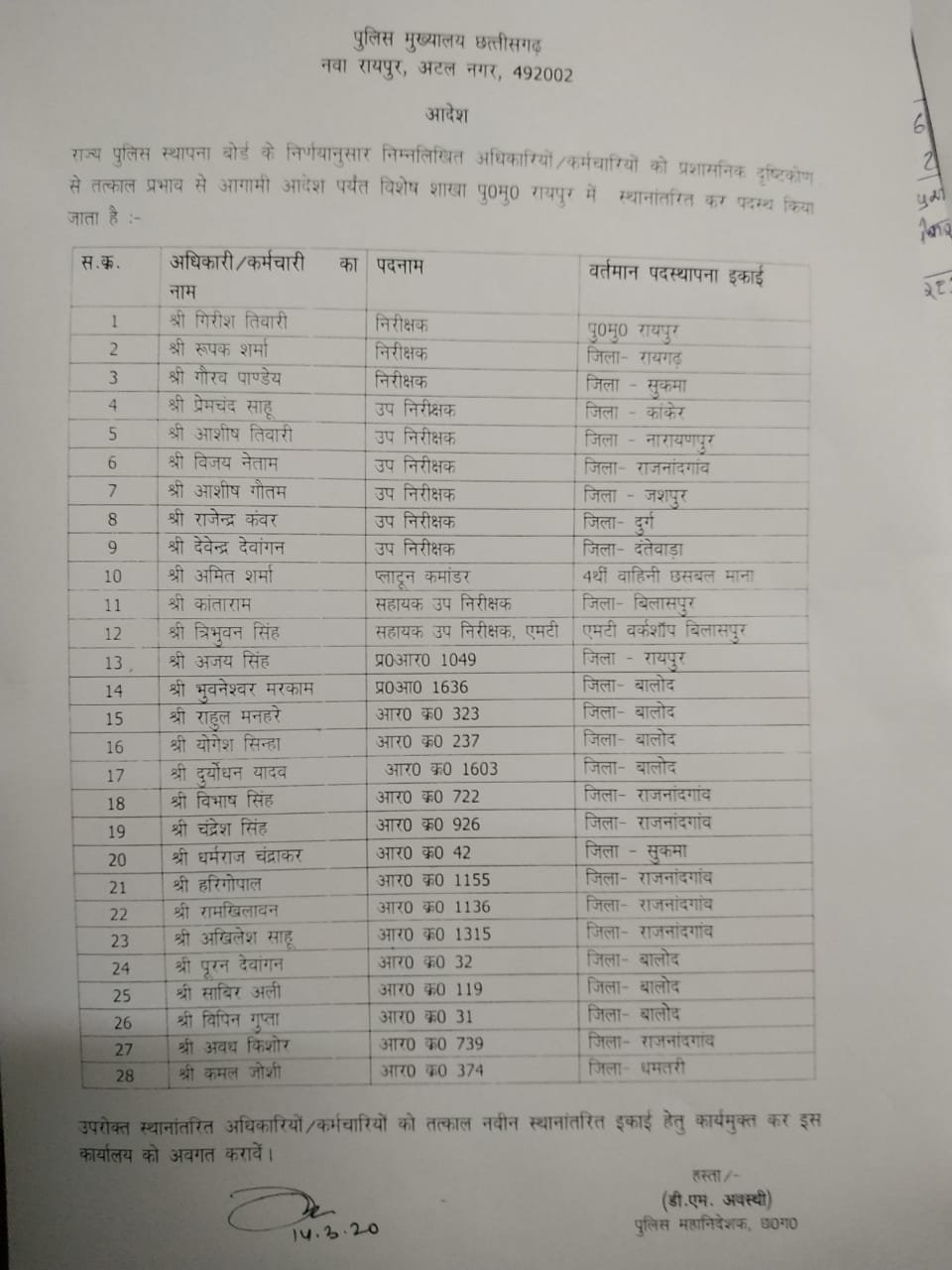 आगामी आदेश तक विशेष शाखा पुलिस मुख्यालय रायपुर में रहेंगे पदस्थ