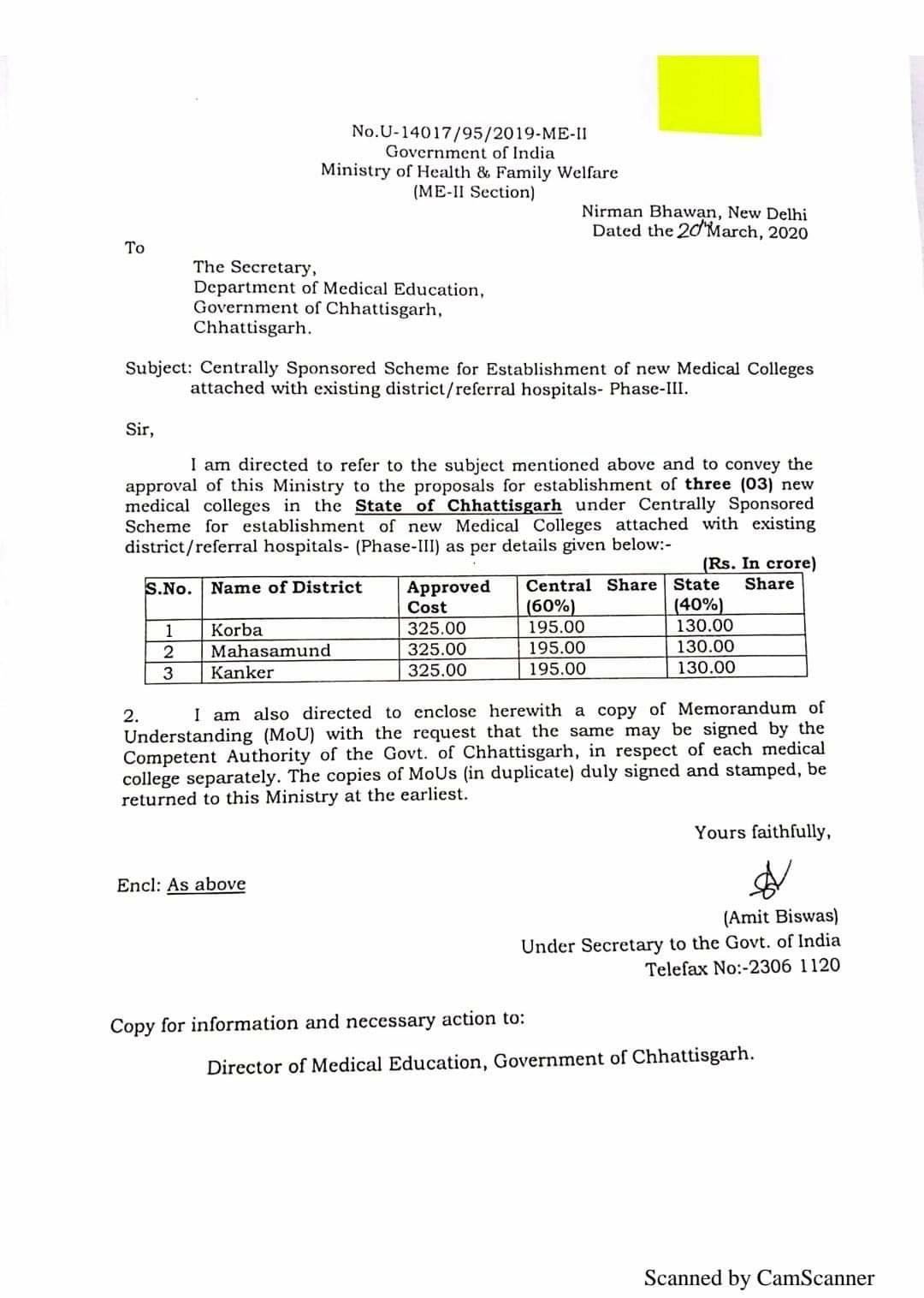 मुख्यमंत्री भूपेश बघेल की पहल पर भारत सरकार के स्वास्थ्य एवं परिवार कल्याण मंत्रालय द्वारा छत्तीसगढ़ के कोरबा, महासमंुद और कांकेर में तीन नए मेडिकल काॅलेजों को स्थापित करने के प्रस्ताव को मंजूरी प्रदान की गई है। इन तीनों मेडिकल काॅलेजों की स्थापना केन्द्र प्रायोजित योजना के तहत कोरबा, महासमुंद और कांकेर में पहले से स्थापित जिला अस्पताल या रिफरल अस्पतालों में की जाएगी।