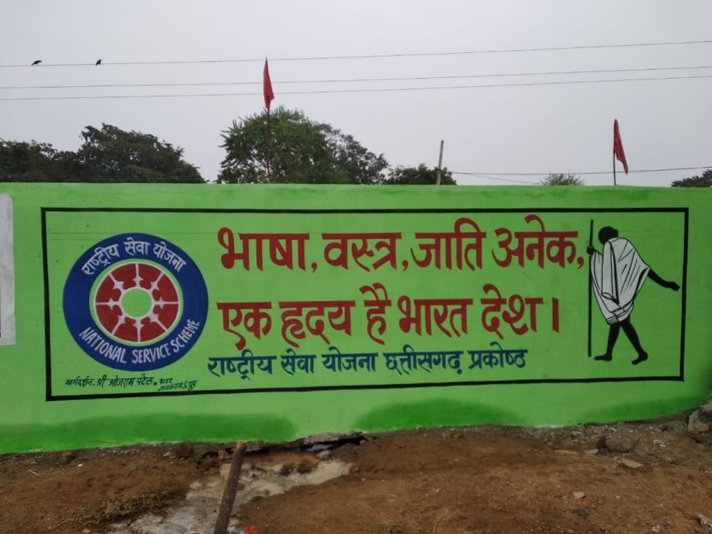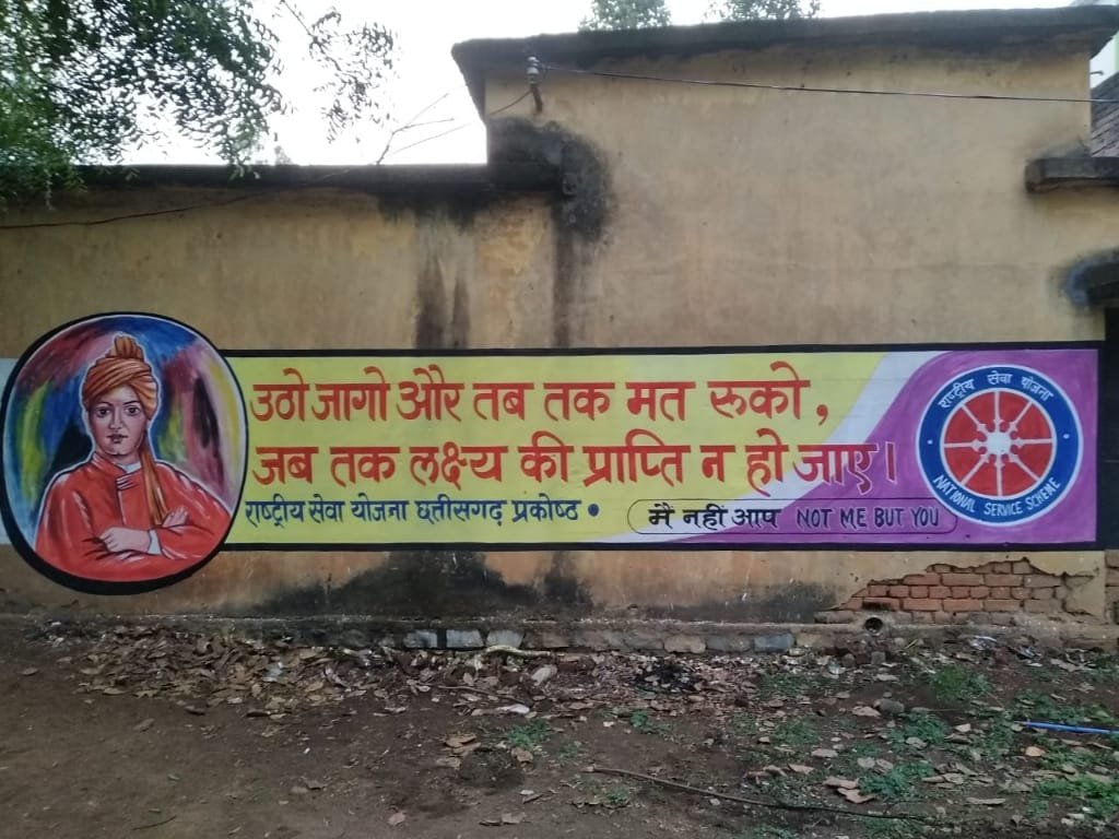 राष्ट्रीय सेवा योजना के सात दिवसीय विशेष शिविर हेतु जहां शिविर स्थल नगर पंचायत परिसर को भव्य रूप में सजाया जा रहा है वहीं राष्ट्रीय सेवा योजना के श्लोगन ,प्रेरक उद्बोधन एवं प्रदेश सरकार की महती योजना नरवा गरवा घुरवा बारी को लेकर विशेष संदेश परख पेंटिंग रासेयो कार्यक्रम अधिकारी भोजराम पटेल के मार्गदर्शन में जनकराम महंत एवं उनके उत्साही सहयोगियों द्वारा किया जा रहा हैं।