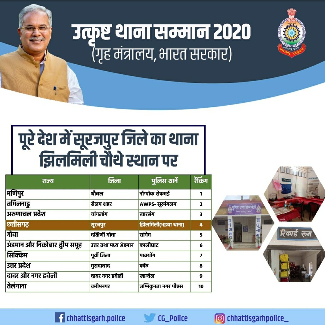 मुख्यमंत्री भूपेश बघेल ने गृह मंत्रालय भारत सरकार द्वारा वर्ष 2020 के ’उत्कृष्ट थाना सम्मान’ में सूरजपुर जिले के झिलमिली थाने को देश में चौथा स्थान मिलने पर झिलमिली थाने के अधिकारियों-कर्मचारियों सहित पुलिस विभाग को बधाई और शुभकामनाएं दी हैं। मुख्यमंत्री ने कहा है कि छत्तीसगढ़ के सूरजपुर जिले के झिलमिली थाने को उत्कृष्टता के मामले में देश में चौथा स्थान मिलना हम सब के लिए गर्व का विषय है।