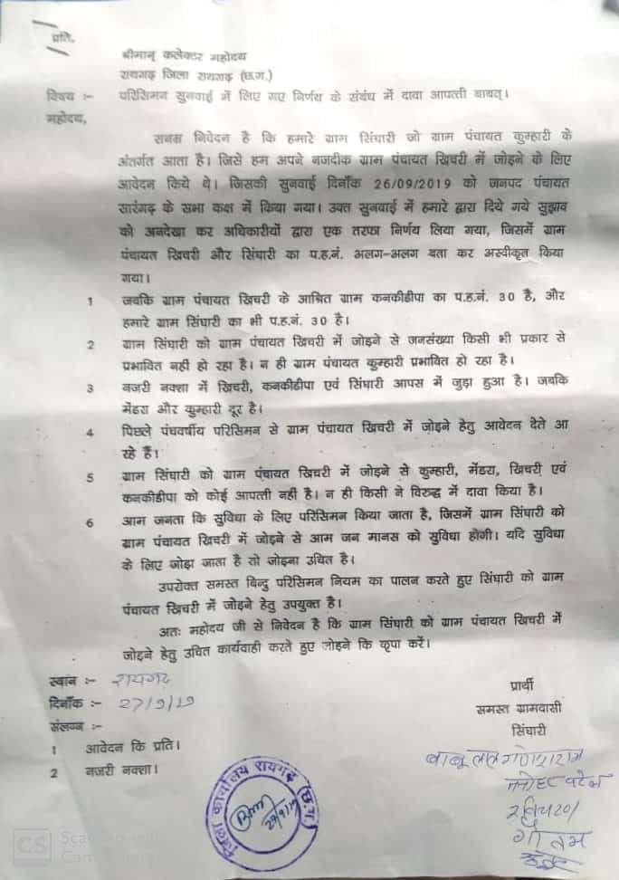 विदित हो कि बरमकेला तहसील मुख्यालय से 3 किलोमीटर दूर स्थित छोटे से ग्राम सिंघारी जहां मात्र 307 मतदाता हैं इस गांव को पिछले पंचायत चुनाव के दौरान 2 किलोमीटर दूर कुम्हारी ग्राम पंचायत के आश्रित ग्राम बना दिया गया था कुम्हारी ग्राम पंचायत का एक अन्य आश्रित ग्राम मेड़रा तो सिंघारी से 5 किमी से भी अधिक दूरी पर है। जबकि गांव वालों की मांग थी अपने गांव से लगे हुए ग्राम पंचायत खिचरी में उन्हें जोड़ा जाए क्योंकि ग्राम पंचायत खिचरी की सीमा सिंघारी से जुड़ा हुआ है जो आधा किमी की दूरी पर स्थित है। यहां के आश्रित ग्राम कनकीडीपा में ही लोकसभा एवं विधान सभा में मतदान केंद्र होने से सिंघारी गांव के लोग मतदान करने आते हैं। अधिकारी सिंघारी गांव को दूसरे पटवारी हल्का होने का तर्क दे रहे हैं जबकि ग्राम पंचायत खिचरी का ही आश्रित गांव कनकीडीपा और सिंघारी दोनों एक ही पटवारी हल्का नंबर से हैं । इस प्रकार अधिकारी अपने असंगत तर्क से ग्रामवासियों को गुमराह कर 5 वर्ष तक इंतजार करने की समझाईश दे रहे हैं जिससे व्यथित होकर सिंघारी ग्रामवासी इस बात का निर्णय लेने के लिए विवश हो रहे हैं कि वह ग्राम पंचायत चुनाव का बहिष्कार करेंगे जिसके लिए पूरी तरह अधिकारियों विशेषकर अनुविभागीय अधिकारी राजस्व सारंगढ़ की मनमानी और जनता के भावना की अनसुनी ही पूरी तरह से जिम्मेदार होगा । अभी भी ग्रामवासियों को उम्मीद है कि संवेदनशील कलेक्टर यशवंत कुमार ग्रामीणों की भावना को समझते हुए उनके गांव को नजदीकी ग्राम पंचायत से जोड़ने हेतु आवश्यक दिशा निर्देश देंगे।