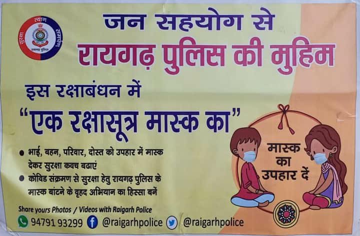 ऐसा ही एक अभियान “एक रक्षा सूत्र मास्क का” आजकल चर्चा में है। यह रायगढ़ जिला पुलिस का एक अनुकरणीय अभियान है जिसके तहत रक्षाबंधन के पावन अवसर पर न केवल भाइयों द्वारा बहनों को, दोस्त द्वारा अपने दोस्तों को, अपने परिजनों, जान-पहचान वालों को या यह कहें कि हर किसी को उपहार में मास्क देने के लिए लोगों को प्रेरित करने का बीड़ा रायगढ़ जिला पुलिस ने उठाया है। इसके तहत जिले के शहरों सहित सुदूर ग्रामीण अंचलों में भी मास्क वितरण कराया जाएगा। यह अभियान एक पंत दो काज को भी चरितार्थ करेगा क्योंकि इससे एक ओर जहाँ लोगों में इस महामारी के दौरान सुरक्षा के प्रति सजगता बढ़ेगी वहीं दूसरी ओर लोग जब एक दूसरे को मास्क का उपहार देंगे तो उनमें आपसी प्रेम और भाईचारा भी बढ़ेगा जो बहुत बड़ी बात है। यही इस अभियान की खास बात है और इसी वजह से लोग स्वेच्छा से इससे जुड़कर इस महायज्ञ में अपनी सहभागिता दर्ज करा रहे हैं।