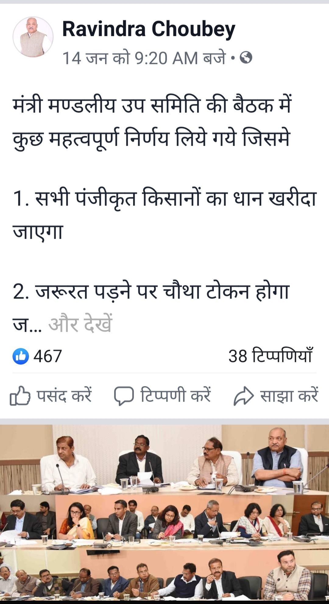 बैठक में प्रदेश के पंजीकृत किसानों से प्रति एकड़ 15 क्विंटल के हिसाब से पूरा धान खरीदने के लिए जरूरत पड़ने पर चौथा टोकन जारी करने का निर्णय लिया गया। समिति ने प्रदेश के उपार्जन केन्द्रों में समितियों की क्षमता के अनुरूप ज्यादा से ज्यादा धान खरीदने का निर्णय लिया। प्रदेश में धान के सुरक्षित भण्डारण के लिए संग्रहण केन्द्र खोले गए है। समिति द्वारा जरूरत के मुताबिक और संग्रहण केन्द्र खोलने एवं कस्टम मिलिंग की गति को और बढ़ाने का निर्णय लिया गया।