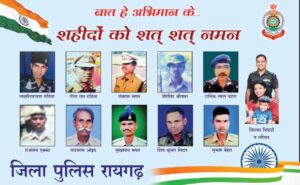 हमर तिरंगा अभियान के दौरान जिला पुलिस रायगढ़ द्वारा जिले में निवासरत शहीदों के परिजनों के सम्मान में पुलिस कंट्रोल रूम रायगढ़ में सम्मान कार्यक्रम का आयोजन किया गया। शहीदों के परिजनों के सम्मान कार्यक्रम श्री उमेश पटेल जी, केबिनेट मंत्री छत्तीसगढ़ शासन, रायगढ़ विधायक श्री प्रकाश नायक, सीईओ जिला पंचायत, तथा जिले के सम्मानीय नागरिकों, मीडिया साथियों, जिला पुलिस के अधिकारी, कर्मचारियों की उपस्थिति के बीच संपन्न हुआ ।