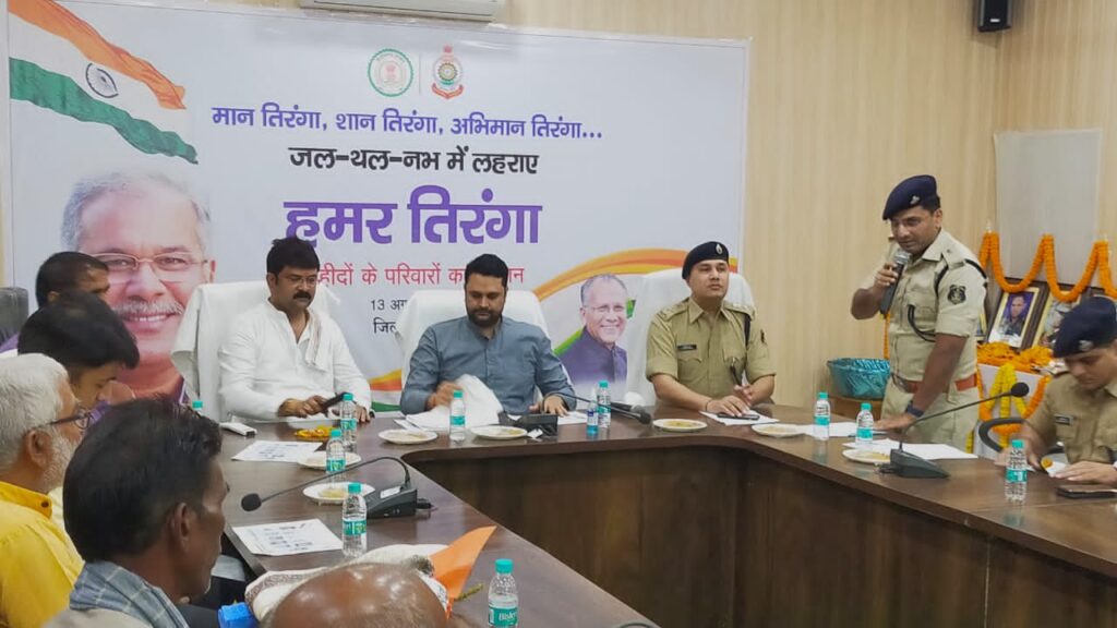 प्रदेश सरकार के “हमर तिरंगा” अभियान हम सभी को गौरवान्वित महसूस कराने वाला अभियान है । हमारे स्वतंत्रता संग्राम सेनानियों के संघर्षों, बलिदान से प्रेरणा लेकर देश प्रेम की भावना से देश सेवा में नौजवान आगे आ रहे हैं । हमारे जवान सैन्य बल में भर्ती होकर देश के तथा राज्य के कई दुर्गम इलाकों में सेवाएं दे रहे हैं । आज हम “हमर तिरंगा” अभियान कार्यक्रम के दौरान हमारे रायगढ़ जिले में निवासरत 11 वीर शहीदों के परिजनों के सम्मान के लिये आज यह “सम्मान कार्यक्रम” में आयोजित किये है ।