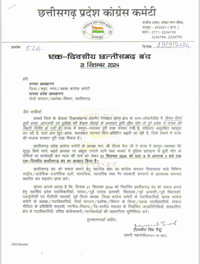 छत्तीसगढ़ प्रदेश कांग्रेस कमेटी के अध्यक्ष दीपक बैज ने 21 सितंबर 2024 को प्रातः 09 बजे से अपरान्ह 03 बजे तक एक दिवसीय छत्तीसगढ़ बंद का आह्वान,कानून-व्यवस्था को सुदृढ़ करने और कवर्धा में पुलिस की प्रताड़ना से हुई मौतों के दोषियों के खिलाफ कार्यवाही की मांग…