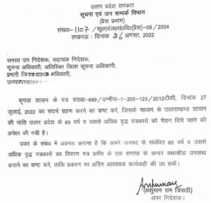 उ.प्र. सूचना एवं जनसंपर्क विभाग ने अधिकारियों से 59 वर्ष से अधिक आयु वाले पत्रकारों का विवरण मांगा है। योगी सरकार के इस फैसले के बाद पत्रकारों में खुशी की लहर है। लम्बे समय से यूपी के पत्रकार पेंशन की मांग कर रहे थे।